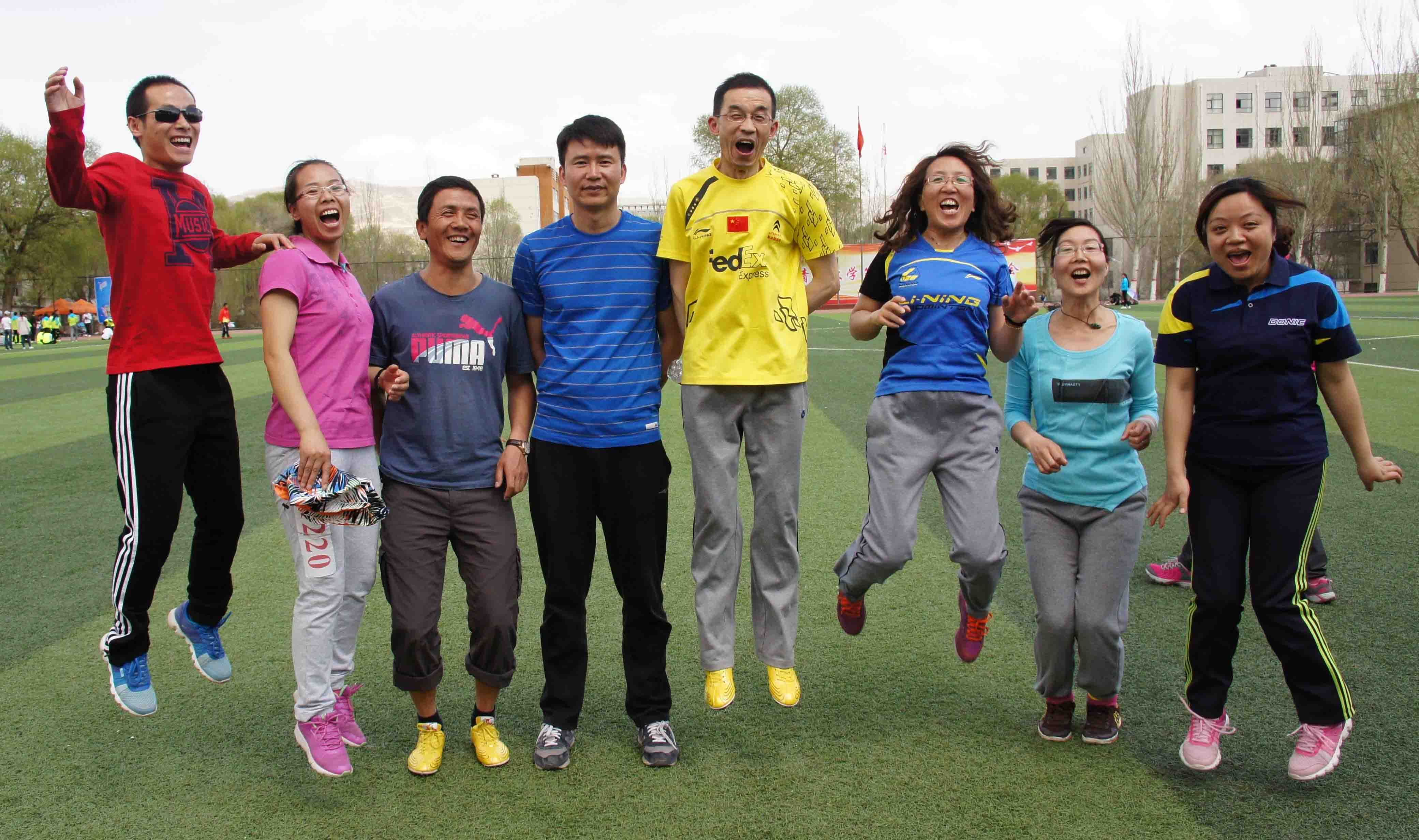 7mmtv 第三十八届田径运动会,图为跑完接力的教工运动员合影。(2016年4月29日 摄影师:陈明彪)